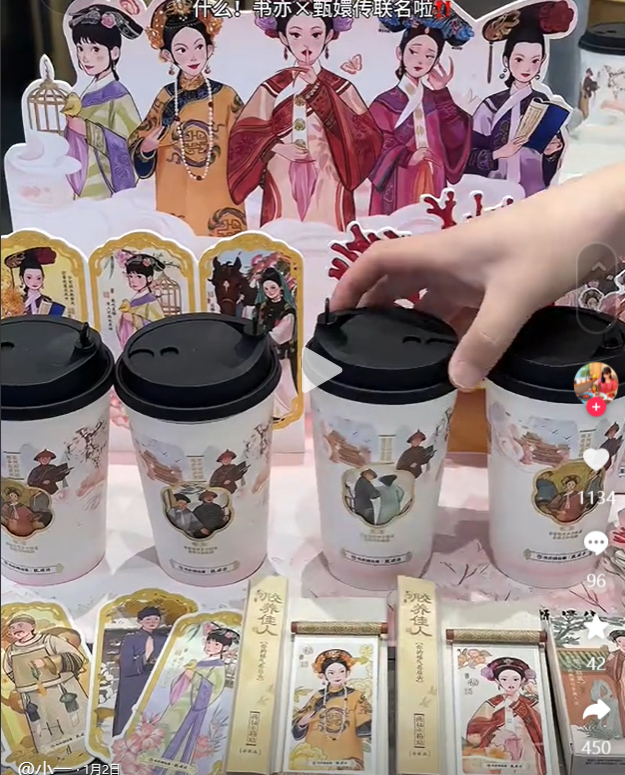 这个月起,书亦烧仙草也联合《甄嬛传》,推出了一系列的联名奶茶、冰箱贴、盲盒小卡等。