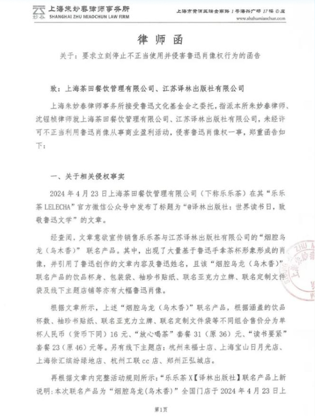 随后不久,乐乐茶就收到了来自鲁迅家属及鲁迅文化基金的律师函,不但下架了所有的产品,还做出了一定的赔偿。