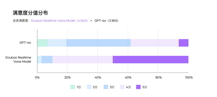 豆包全新实时语音通话功能与同类产品拉开明显差距,中文对话断崖式领先,同时,情商智商双双在线。据外部真实反馈,用户对豆包此次上线的全新语音通话功能整体满意度为 4.36/5,对 GPT-4o 语音对话满意度则为 3.18/5,尤其语音语气自然度和情绪饱满度方面,豆包有明显优势。