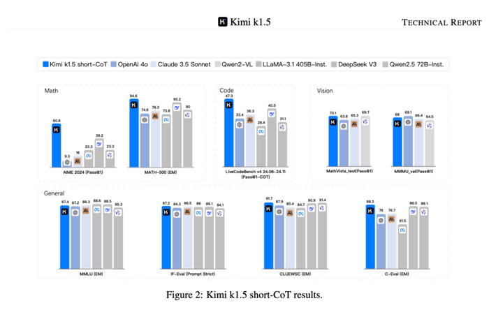 除了数学能力外,在代码视觉多模态和通用能力等场景下,Kimi 1.5也超越了目前的开源模型。