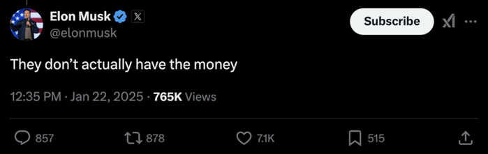 但埃隆·马斯克很快泼来了冷水,表示:“实际上他们没有钱”。