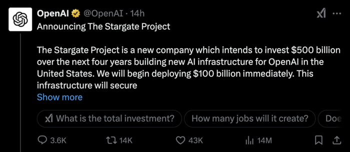 据悉,“星际之门项目”将成立一家新公司,计划在未来四年投资5000亿美元,为OpenAI在美国建立新的人工智能基础设施。