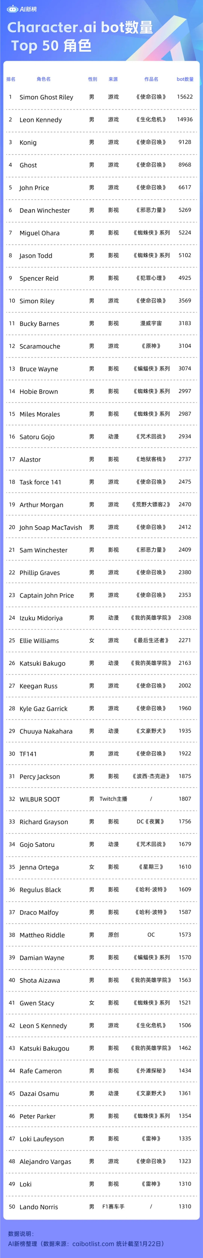 按照用户创建角色的AI bot数量,C.ai Top50角色如下: