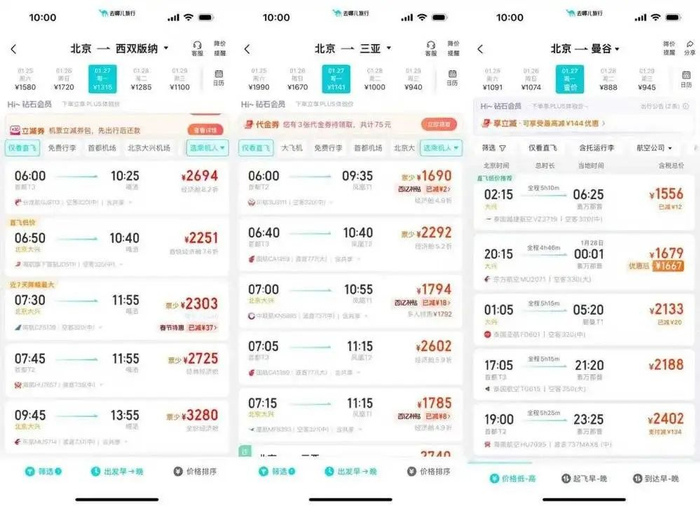 “定焦One”近期在去哪儿网对比机票价格发现,在国内游运力增加的情况下,机票价格出现回落,但同为1月27日从北京出发,直飞三亚和西双版纳的航班,仍旧要比直飞曼谷的贵几百块钱。