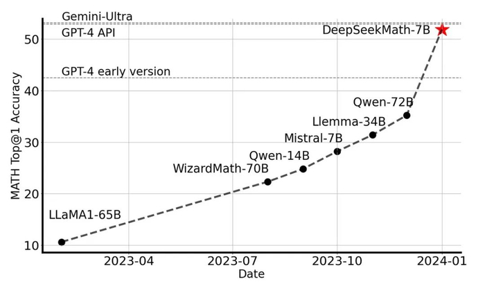 2024年2月5日,DeepSeek 发布了又一款垂直领域模型——数学推理模型 DeepSeekMath。这款仅有 7B 参数的模型,却在数学推理能力上直逼 GPT-4,在权威的 MATH 基准榜单上,力压群雄,超越了一众参数规模在 30B-70B 之间的开源模型。DeepSeekMath 的问世,充分展现了 DeepSeek 在垂直领域模型研发上的技术实力和前瞻布局。