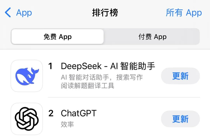 于是,截止到了 2025年1月27日,DeepSeek App 成功超越 ChatGPT,登顶美国 iOS 应用商店免费应用下载榜首,成为了现象级的 AI 应用。