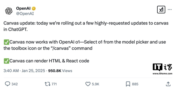 OpenAI 更新 ChatGPT Canvas 写作工具:上线 o1 模型、新增支持渲染 HTML / React 代码