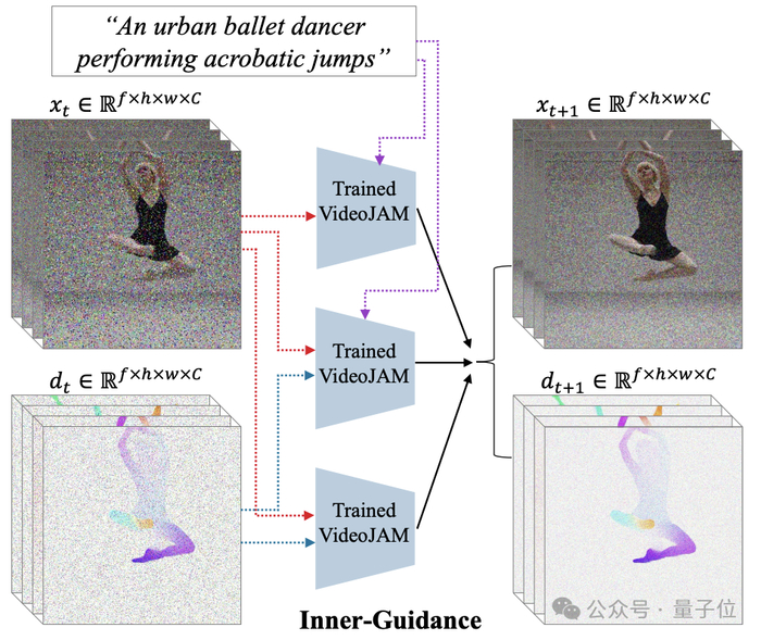 到了推理阶段,VideoJAM 采用了内部引导机制(Inner-Guidance Mechanism),进一步增强生成视频的运动一致性。