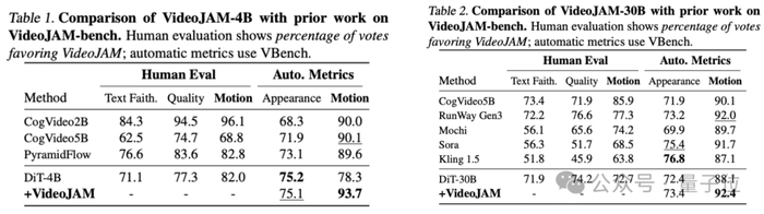 结果在 4B 和 30B 规模下,相比于原始的 DiT 模型,运动质量从 78.3 和 88.1,分别提升到了 93.7 和 92.4,提升比例分别为 19.67% 和 4.88%。