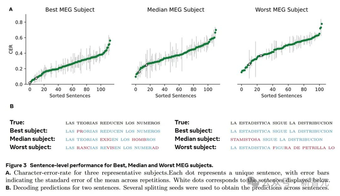 尽管平均性能上存在显著差异,研究人员也注意到了个体之间的差异。EEG表现最差和最好受试者的CER分别为61%(±2.0%)和71%(±2.3%)。MEG表现最差和最好受试者的CER分别为45%(±1.2%)和19%(±1.1%)。也十分明显。