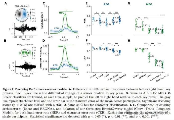 结果显示,EEGNet在MEG数据上优于线性模型,但在EEG数据上的优势不明显。Brain2Qwerty模型在EEG和MEG数据上的表现均显著优于EEGNet和线性模型。