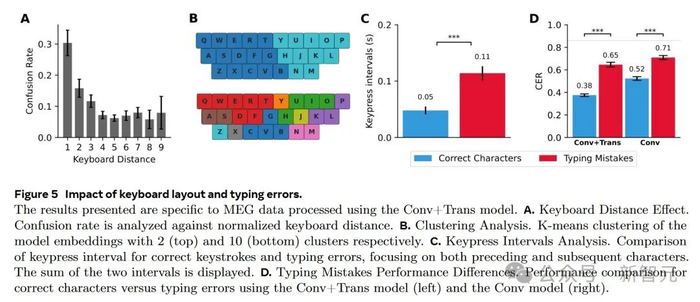 为了评估打字错误对解码性能的影响,研究人员分别评估了正确按键和错误按键的字符错误率(CER)。使用 Conv+Trans模型时,正确按键的CER为38%,而错误按键的CER为65%。