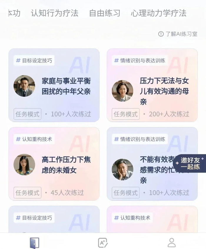 AI练习室收费99元一年,且不限次练习。这款功能上线7天,练习次数便迅速突破100万。心理咨询师是一个要不断进修的特殊行业,对场景练习的需求庞大,而咨询师在工作前期普遍低价攒经验,甚至要贴钱约督导,AI则以低价同时满足大量练习和辅导需求。