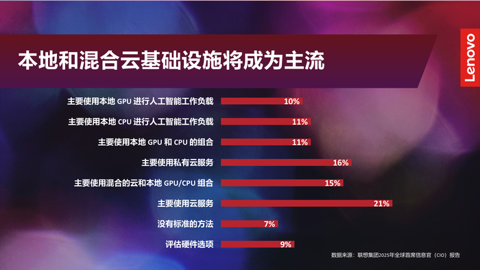 此外,报告认为本地和混合云基础设施将成为主流选择。63% 的企业将其 AI 工作负载部署在本地或混合云上,以通过混合方案来综合本地的安全性、对基础设施的控制性与云计算的灵活性、可扩展性和性能优势。