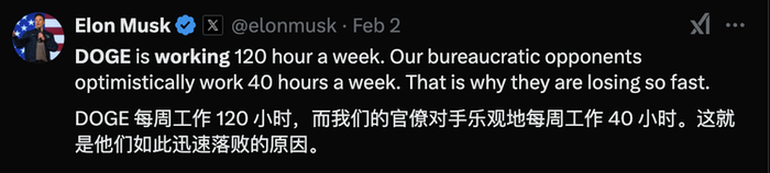 马斯克在X上宣称,DOGE员工一周工作120小时,而联邦机构员工仅40小时。“快速行动、破除陈规”,这正是马斯克标志性的领导风格。