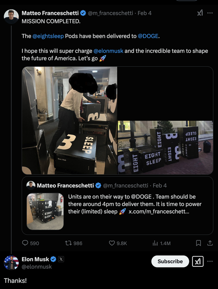 高科技床垫公司eightsleep应马斯克要求调运了一批床垫送到doge的办公室。