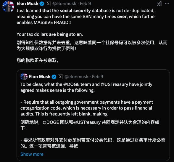 在针对美国财政部的调查中,DOGE发现了“欺诈”行为。马斯克在X是提到了财政部发放的款项问题,“我得知目前每年有超过1000亿美元的福利金发放给没有社会安全号码(SSN)甚至临时身份证的个人。如果属实,那这极其可疑。”