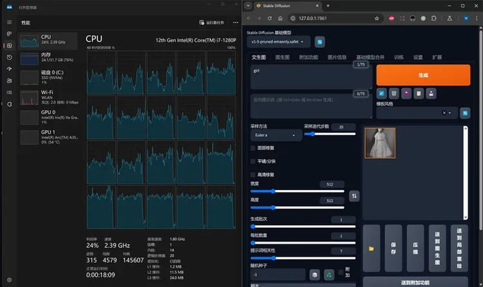 然而实测结果显示,无论11900K还是1280P,都可以顺利运行这些来自英特尔的本地大模型套件。在任务管理器中可以看到,这两台电脑都可以使用CPU来运行AI绘图、AI对话等等功能。
