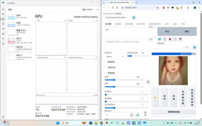 可能有的朋友会说,因为这用的这是英特尔优化过的AI软件,所以没什么代表性。那么,接下来我们换成知名的、可公开免费下载的AI绘图软件“绘世启动器”。众所周知,它是目前最易用的本地AI绘图软件之一。但正如大家所见,它充分利用了这台老PC上ARC A770的计算单元和16GB的显存,实现了在无网络情况下的本地文生图运算。