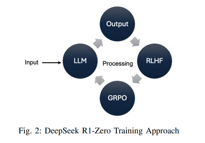 图2展示了DeepSeek R1-Zero模型的训练过程,显示了从输入到输出的流程。最初,输入由LLM处理,然后通过GRPO进一步优化,并根据RLHF进行调整,生成最终输出。这一循环确保模型不断改进,在复杂任务和操作效率方面表现出色。