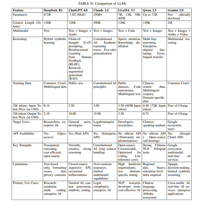表II展示了DeepSeek R1、ChatGPT-4、Claude 3.5、LLaMA 3.1、Qwen 2.5和Gemini 2.0的全面比较。