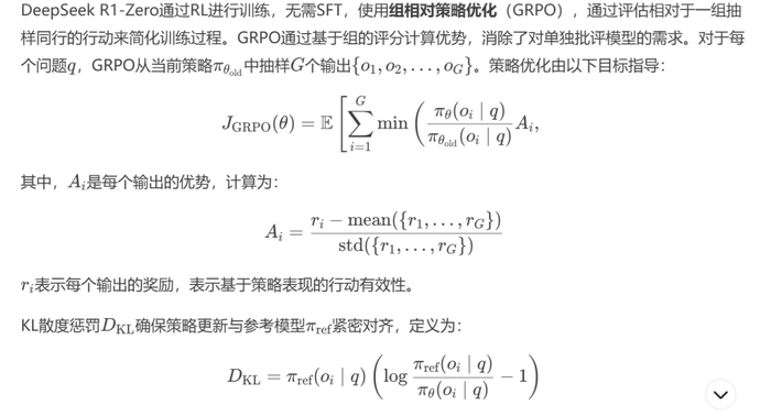 DeepSeek R1-Zero鼓励涌现行为,如迭代自我反思和扩展推理链,提高了复杂任务的准确性。然而,挑战包括可读性差和语言混合。此外,当同行组NN较小或缺乏多样性时,基于组的优势估计可能会受到高方差的影响,这可能导致策略更新不稳定。