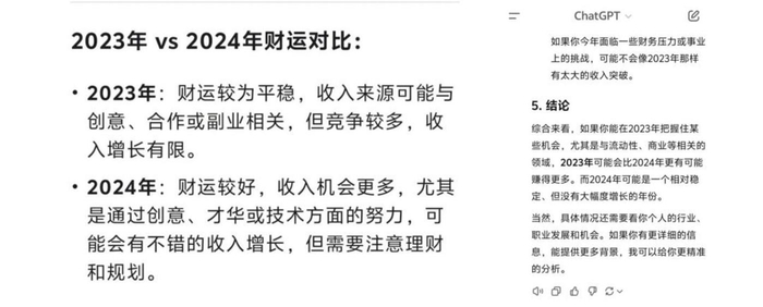 在财运方面,网友的命盘显示2020年和2023年财运较差,2024年会明显好转。可ChatGPT的预测却完全不对,Deepseek也只算对了一部分。至于学业和感情运,两个AI的预测结果更是大相径庭,跟真人算命的结果更是相去甚远。
