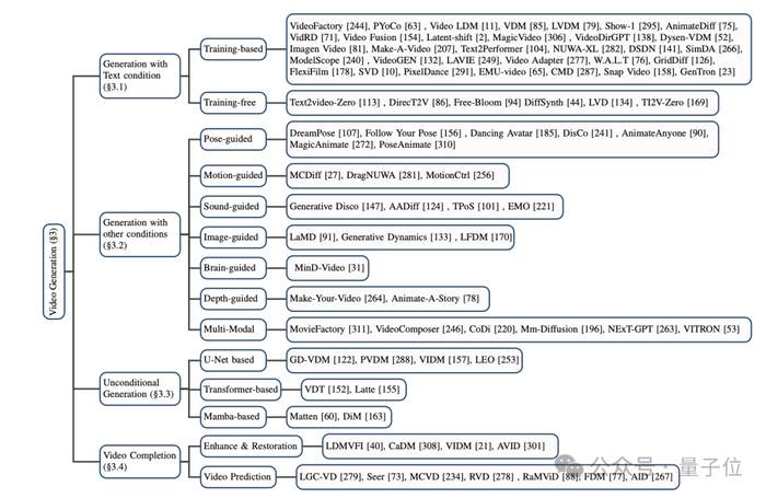 本文将目前基于扩散模型的主流视频生成模型分为三大类:基于文本的视频生成,基于其他条件的视频生成,以及无条件的视频生成。