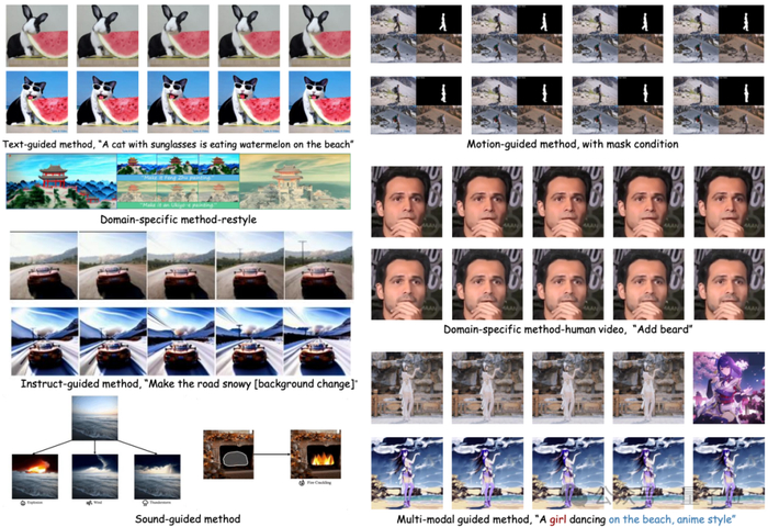 随着大模型时代的到来,除了最为直接的自然语言信息作为条件的视频编辑,由指令、声音、动作、多模态等作为条件的视频编辑正受到越来越多的关注,作者也对相应的工作进行了分类梳理。
