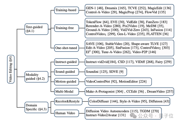 对于基于扩散模型的视频编辑方法,本文同样将目前主流的模型分成了三大类:基于文本的视频编辑,基于其他条件的视频编辑,以及特定细分领域的视频编辑。