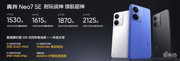 智东西2月25日报道,刚刚真我realme发布了真我Neo7 SE系列智能手机新品,其搭载了天玑8400-MAX,配备了7000mAh电池以及IP69满级防尘防水,起售价1799元起,国补到手价1530元。