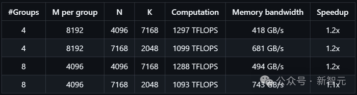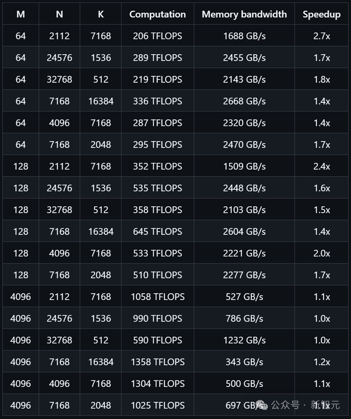 下表展示了不同矩阵维度(M、N、K)下DeepGEMM库的性能数据,结果显示在某些配置(如 M=128, N=2112, K=7168)下实现了高达 2.4 倍的加速,反映了DeepGEMM在优化GPU矩阵计算方面的效率和灵活性。