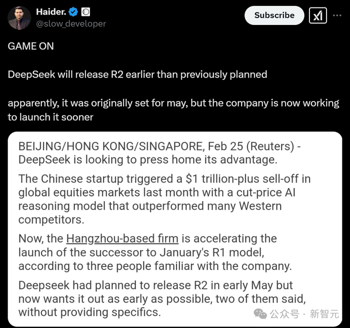 同时,外媒还曝出了另一个重磅消息:原计划在5月初发布的DeepSeek-R2,现在发布时间将再次提前!