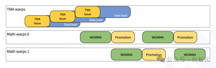 TMA线程主要负责数据加载(Data load)和任务分发(TMA issue),用黄色和蓝色表示。数学线程则交替执行WGMA(Wavefront Matrix Multiply-Accumulate)计算(绿色)和数据提升(Promotion,黄色),展示了一种并行计算策略,其中数据加载与矩阵计算和优化操作协同工作,以提高效率和性能。