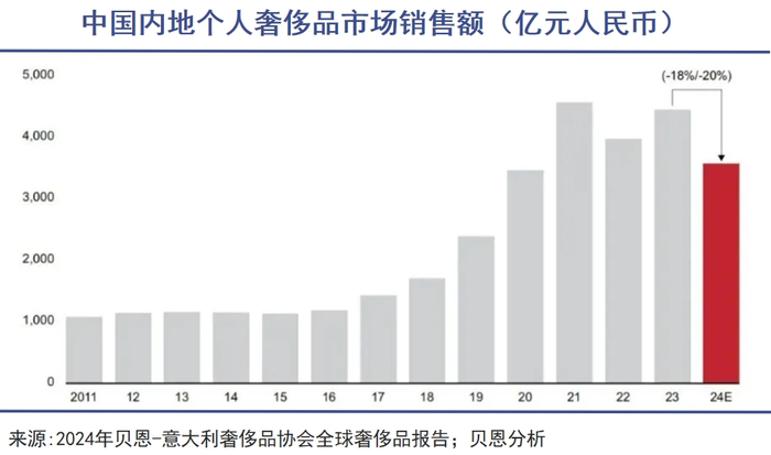 2025年,贝恩公司发布了《2024年中国奢侈品市场报告》。报告指出,2024年中国内地个人奢侈品市场销售额预计下降18%~20%。