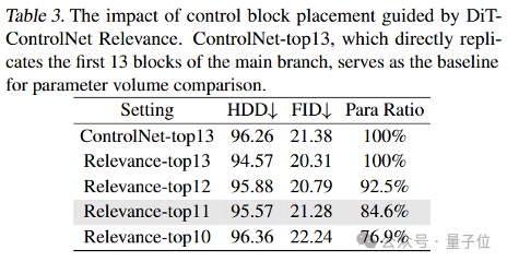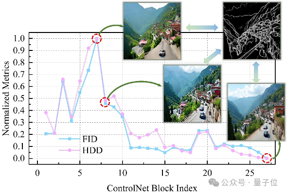 这些指标有助于分析跳过控制分支中各个层对整体性能的影响,并为每个控制块提供相关性分数。最终,基于这两个指标的组合,研究团队计算得到ControlNet的相关性分数,并从中选取了11个最关键的控制位置(按相关性从高到低排序)用于集成控制模块,如图中白色序号所示。