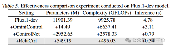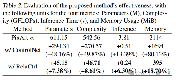 根据下表所示,基于PixArt-α的RelaCtrl仅带来了7.38%的参数增加和8.61%的计算复杂度增加,显著低于ControlNet方法的增量,后者的参数和复杂度均增加了近50%。在Flux.1-dev上的实验进一步验证了这一点,RelaCtrl在参数量和计算复杂度的增加上实现了均衡,同时在多个指标上显著优于ControlNet方法。这一优势同样体现在实际推理时间上,RelaCtrl表现出了更高的效率。