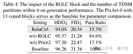 通过这种方法,团队实现了与使用了13个复制块的PixArt-δ相当的控制性能,同时将参数数量减少了约15%。