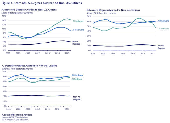 2025年1月,CEA(Council of Economic Advisers,美国总统经济顾问委员会)发布了一份详细的人工智能人才报告,全景式地扫描了美国AI人才的现状。