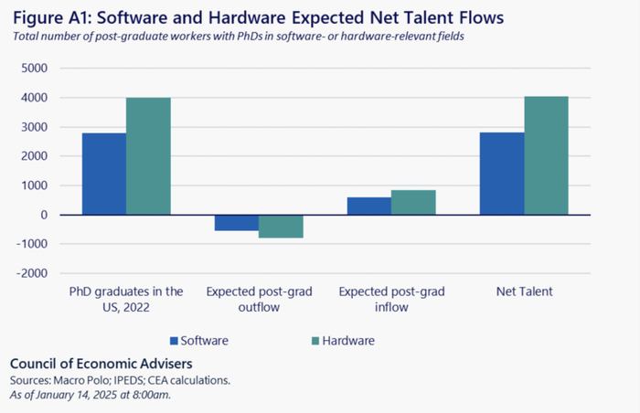 例如,芯片设计工程师越来越依赖AI进行优化,而掌握计算机架构的硬件专家,也往往会参与AI模型的开发。因此,CEA认为,尽管软件和硬件分类存在一定交叉,但它们仍然是分析AI高端人才供给结构的有效方式,以更好地理解美国AI人才市场的现状及未来需求。