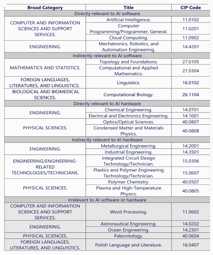 为此,CEA 设计了一套基于学位的AI人才分类系统,这一系统的核心逻辑是:AI行业需要的技能并不局限于明确的“人工智能”专业,而是涵盖更广泛的相关学科。具体来说,在美国国家教育统计中心(NCES)IPEDS数据库的2320个学术领域中,CEA选取了154个学科归类为AI相关。