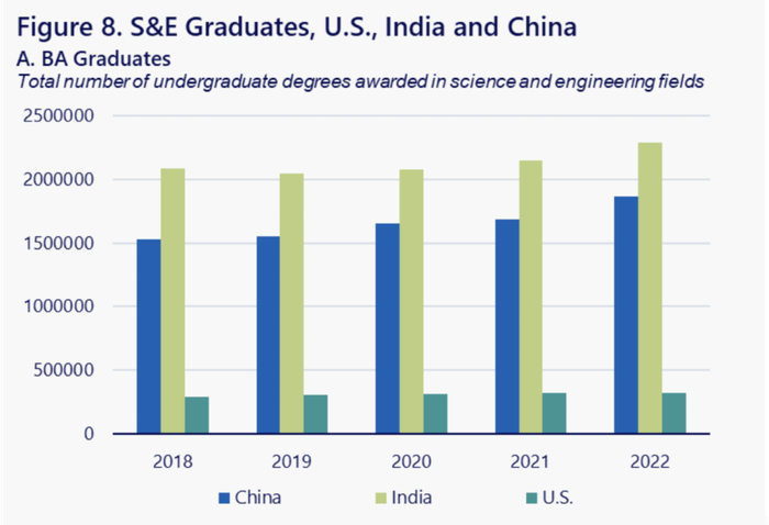 在科学与工程学士学位层面,美国的授予数量虽然领先于大多数国家,但并非最高。印度授予的学士学位数量超过美国,而中国不仅在学士学位上超过美国,在博士学位数量上也遥遥领先。