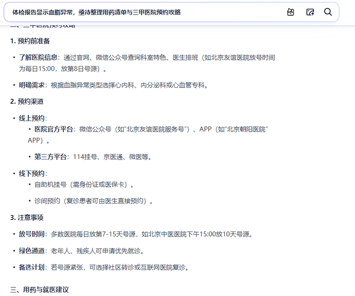 有人的体检报告显示血脂异常,亟待整理用药清单与三甲医院预约攻略,可以用AI健康助手;