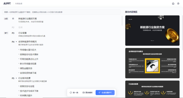 有人需要一份新能源行业融资PPT模板,但模板必须自动嵌入今日股价波动数据,她可以直接用AI PPT;