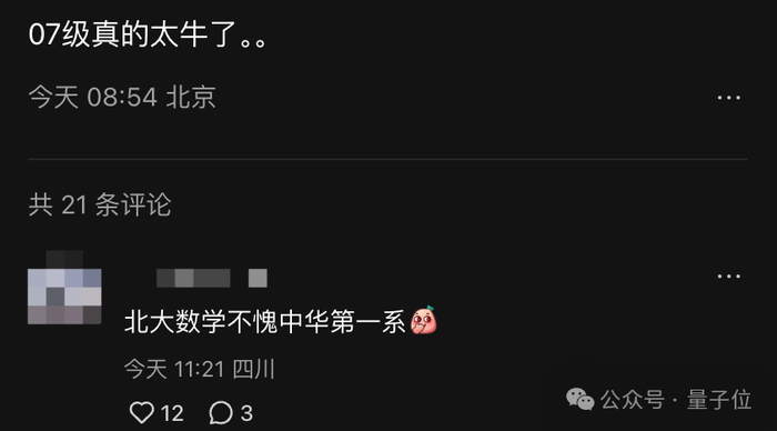 不仅如此,网友们结合之前北大校友王虹(91年生,16岁考入北大,07级)破解了挂谷猜想,直呼“北大数学系不愧中华第一系”、“07级真的太牛了”。