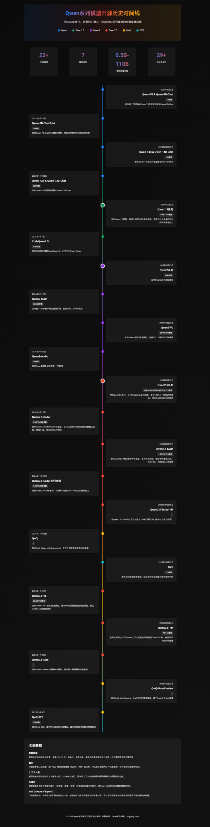 然后今天QwQ不是开源了32B的推理模型吗,我又让Manus随手做了一个千问开源的时间线。
