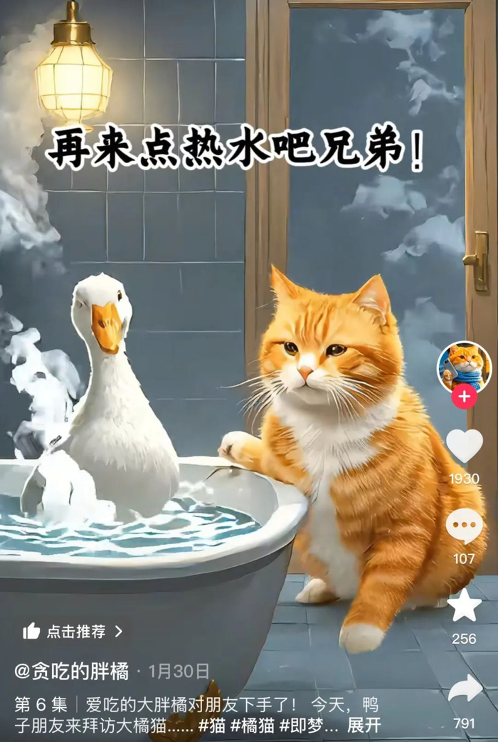 幸好,暴戾动物及时补位,打破了AI萌宠人畜无害的刻板印象,填补了作恶赛道。有只邪恶橘猫,骗过路的鸭子喝茶,药倒后就红烧。橘猫还打电话给鸡哥,邀请人去他家洗澡,转头拔毛把人给烤了。猪哥好心请橘猫喝啤酒,橘猫却把猪哥做成了红烧肉。