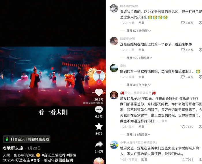 起初这些阴间内容本是吓人的,后面却变成普通人悼念亡故亲人的赛博法会。账号“地府文旅”过年期间发布的视频下,本以为会是抽象恶搞的评论区,竟有不少思念家人的孩子。“姥姥在地府过的第一个春节”、“爸爸妈妈你们在那边吃年饭了没,今年又是我一个人过”、“地府电视不要放保健品广告,我姥爷总上当”……