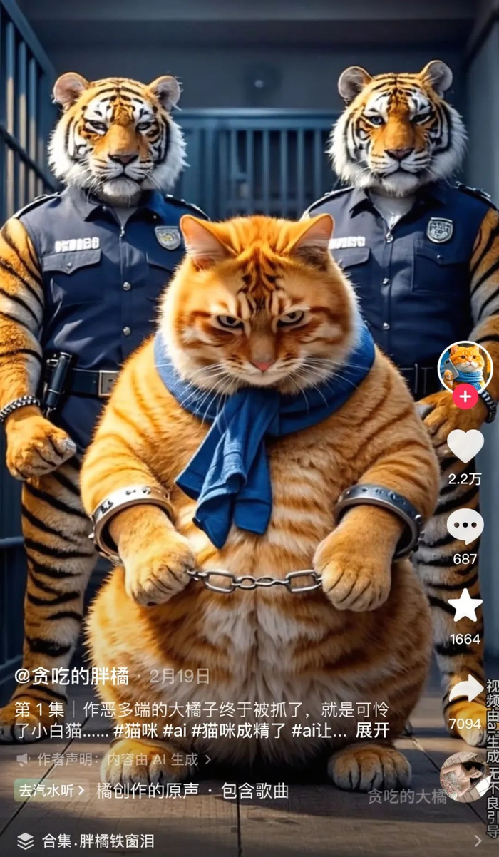 与此同时,唱着“土鸡土鸡蛋”的AI萌宠也变成了寓言故事里的反派。一只大橘经常给别的小动物打电话,来了就请它们喝酒,再烹饪成啤酒鸭、大盘鸡、炖牛肉。AI小动物干起坏事来果然不用承担法律责任,网友想网暴它连抖音号都找不着。