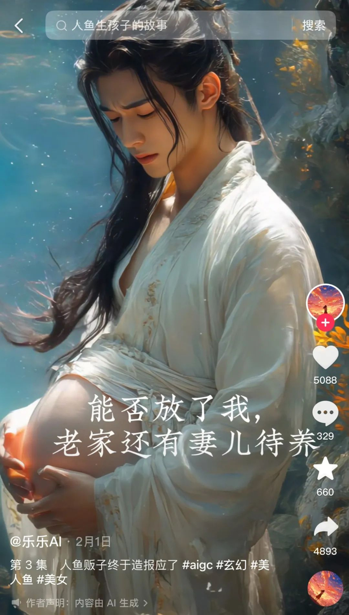 值得注意的是,十个AI男人生子视频有八个都跟美人鱼有关。这固然有创作者的猎奇目的,也不排除受到了西方塞壬、中国鲛人、日本八百比丘尼等传说影响。用人鱼的神秘融合生育的恐惧,准保男人吓出一身冷汗。